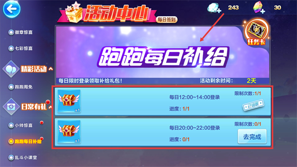 4、參與【跑跑每日補(bǔ)給】活動(dòng),每日限時(shí)登錄領(lǐng)取【補(bǔ)給禮包】,積累資源留意活動(dòng)剩余時(shí)間。