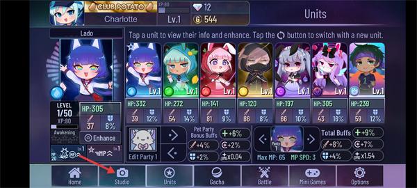1、在【Units】界面查看角色的【HP】【Level】等信息,點擊角色可進行【Enhance】等養成操作。