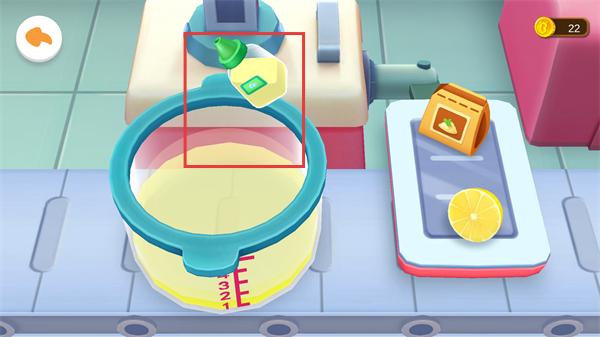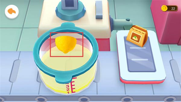 1、容器內(nèi)出現(xiàn)加工后的液體,同時托盤上有檸檬道具,準(zhǔn)備將這些道具添加到容器中,推進果汁制作。