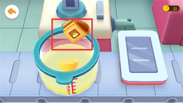 4、將托盤上的包裝類道具投入容器,完成所有配料的添加,進一步推進果汁制作流程。