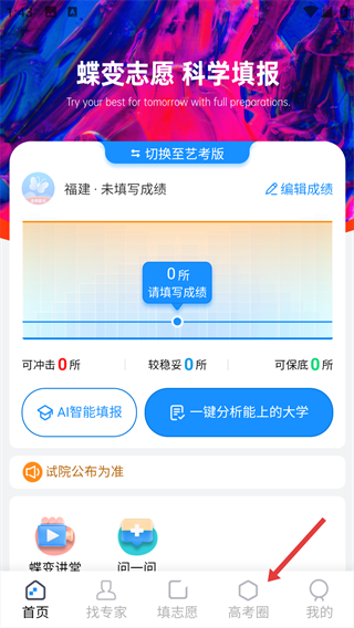 1、點擊底部【高考圈】選項,進入高考圈的動態交流頁面。