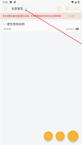 1、打開小周便簽應(yīng)用,點擊頂部全部便簽選項展開操作菜單。