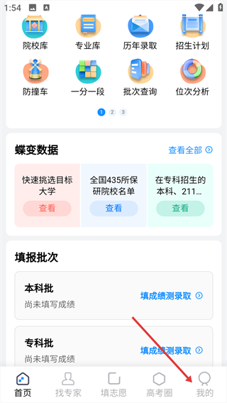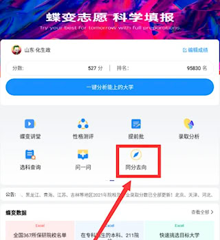 1、進入蝶變志愿app,在首頁上方功能欄找到“同分去向”。
