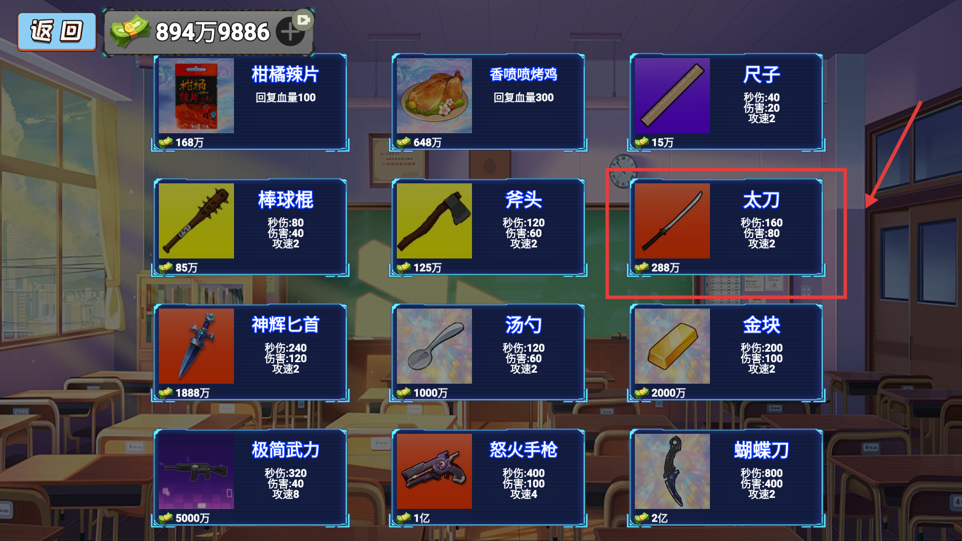 1、在商店界面可購(gòu)買(mǎi)【太刀】,它秒傷160且傷害80,用288萬(wàn)游戲貨幣獲取,提升戰(zhàn)斗能力。