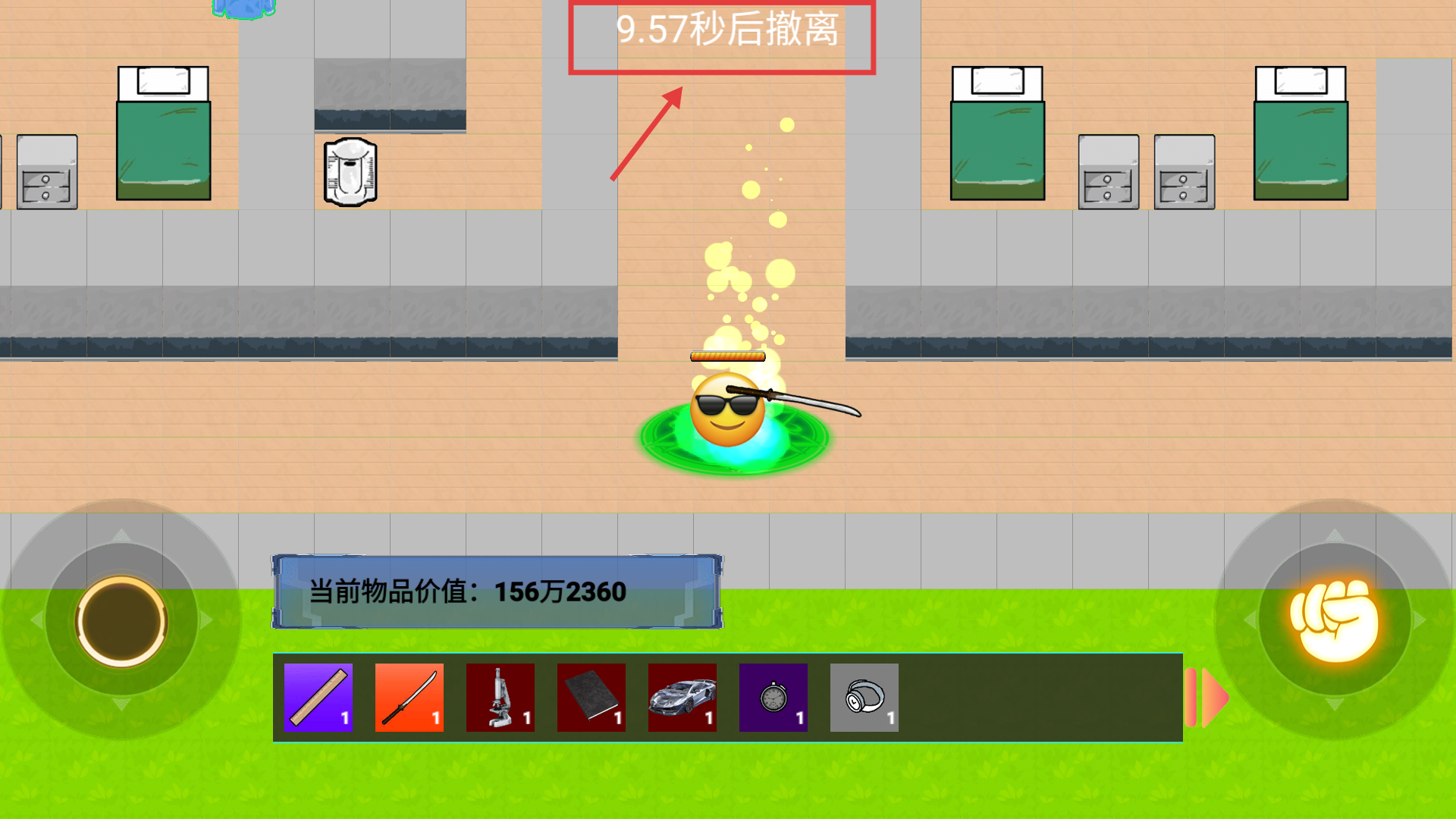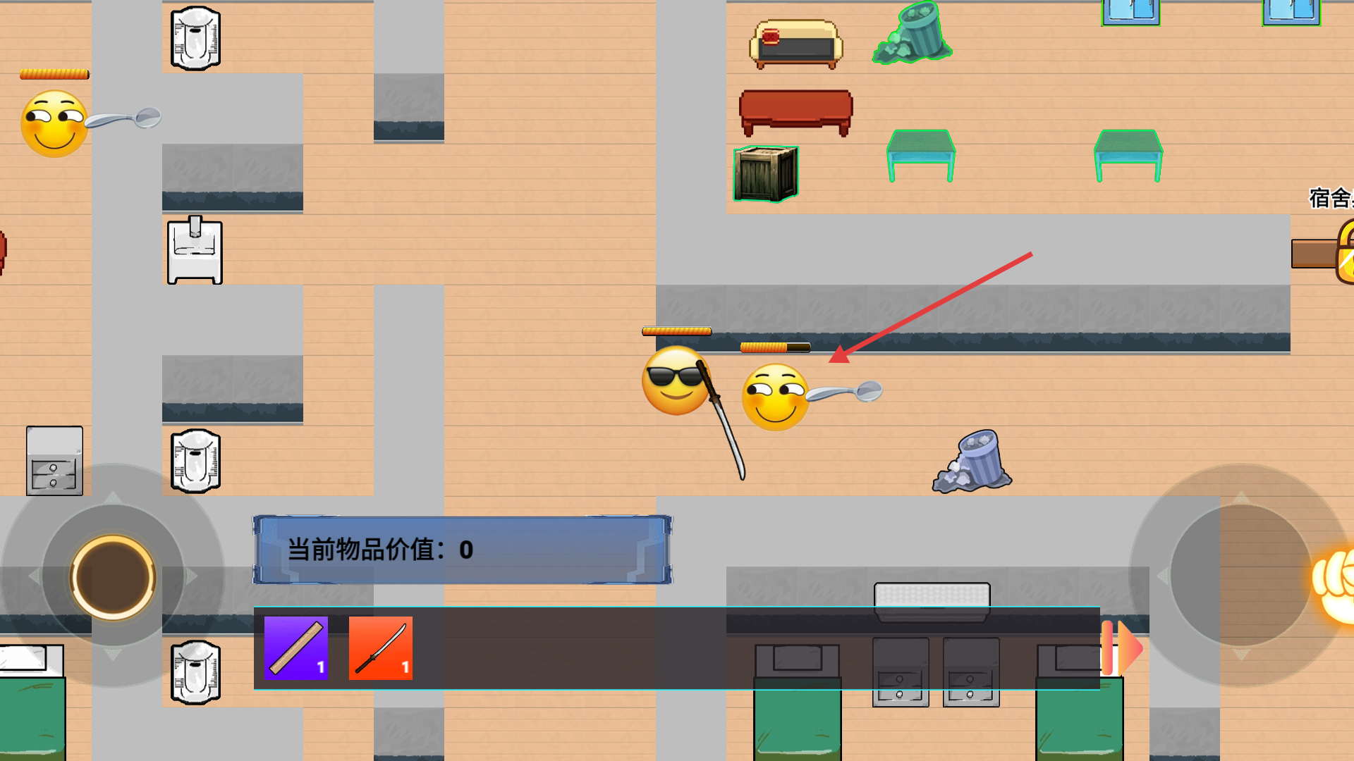 2、宿舍場(chǎng)景中,底部物品欄的武器可互動(dòng),擊敗目標(biāo)獲取物品,積累價(jià)值提升收益。