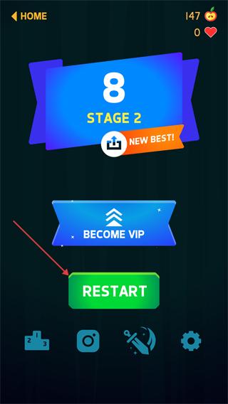 4、關卡結束后,點擊【RESTART】按鈕可重新挑戰當前關卡,沖擊更高分數。