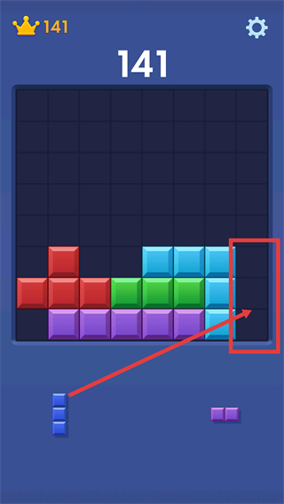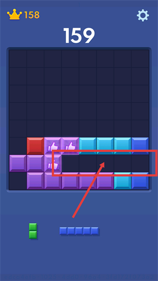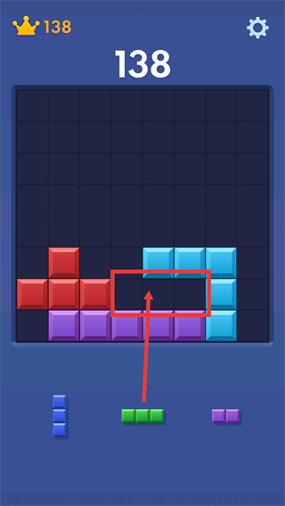 1、拖動(dòng)【藍(lán)色方塊】到【網(wǎng)格】合適位置,為填滿行或列消除方塊做準(zhǔn)備,逐步積累分?jǐn)?shù)。