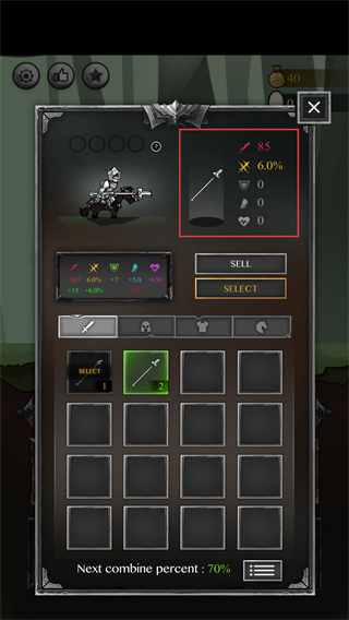1、選擇界面中帶有【85】攻擊力-【60%】加成的武器,點(diǎn)擊【SELECT】按鈕裝備,提升角色攻擊能力,注意后續(xù)合成百分比。