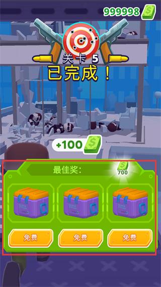 1、關卡5完成后獲得【+100】金幣,點擊【免費】按鈕開啟三個寶箱,可獲取額外獎勵。