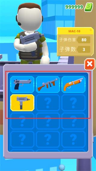 3、在武器選擇界面,可查看已解鎖武器(如MAC-10,傷害80、子彈數3),選擇后進入關卡。