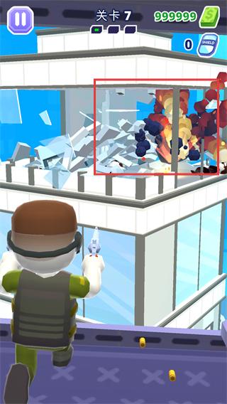 2、進(jìn)入關(guān)卡7后,瞄準(zhǔn)建筑內(nèi)目標(biāo)(含紅色爆炸物),發(fā)射武器清除目標(biāo)并觸發(fā)爆破特效,推進(jìn)任務(wù)。