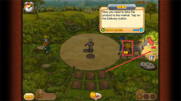 1、點擊界面右側(cè)的【Delivery按鈕】,將收獲的南瓜產(chǎn)品運送至市場,完成該環(huán)節(jié)的交付操作以推進關(guān)卡。