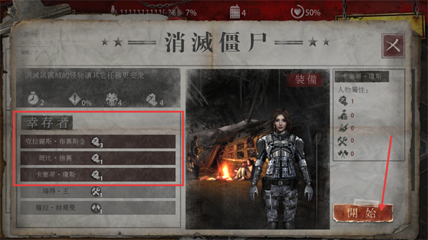 2、進入【消滅僵尸】界面后,選定【幸存者】,點擊【開始】按鈕執行任務。