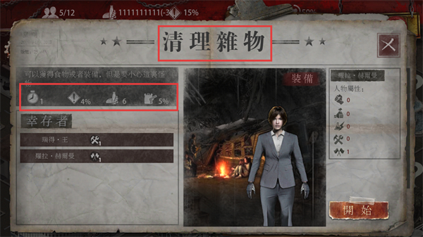 3、選擇【清理雜物】任務,可獲得食物或經驗,注意界面顯示的資源收益,點擊【開始】啟動任務。