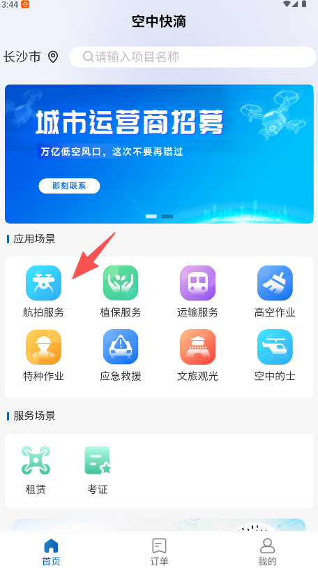 1、在首頁應用場景區域選擇目標服務如“航拍服務”。