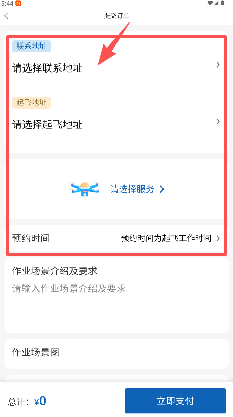 2、進入訂單頁點擊“聯系地址”與“起飛地址”設置位置。