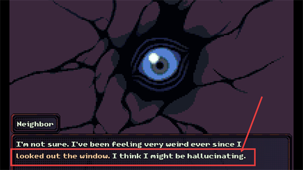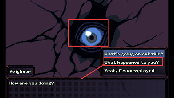 3、與【Neighbor】對話時,選擇【W(wǎng)hat-happened-to-you?】選項(xiàng),以此推進(jìn)劇情,獲取對方的狀態(tài)相關(guān)信息。