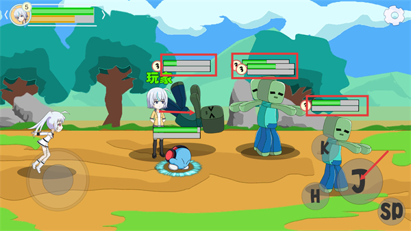 3、進(jìn)入戰(zhàn)斗場景后,面對多名敵人,可使用【J】鍵發(fā)動攻擊,同時留意敵人的血條狀態(tài)來調(diào)整戰(zhàn)斗節(jié)奏。