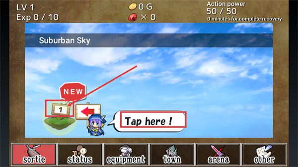 1、在【Suburban-Sky】界面中,按照【Tap-here!】提示點擊標注的【1】號區域,開啟對應關卡的探索與戰斗流程。
