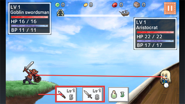 3、戰斗中觀察【Goblin-swordsman】的HP-BP消耗情況,結合自身狀態選擇攻擊節奏,必要時可使用道具恢復狀態。