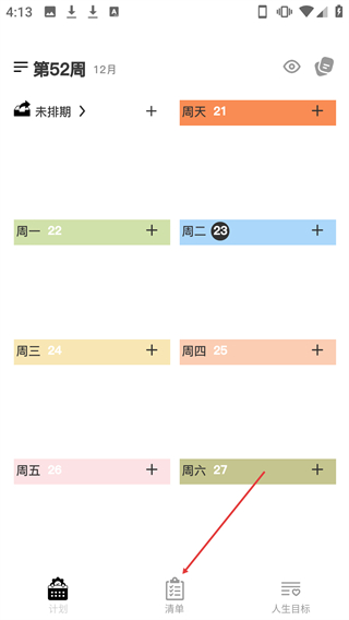1、在【第52周】頁面,點(diǎn)擊底部導(dǎo)航欄的【清單】選項(xiàng),可進(jìn)入清單頁面。