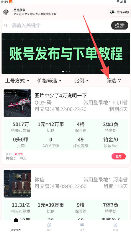 1、賬號(hào)瀏覽與多維篩選功能,支持按游戲、區(qū)服、價(jià)格、角色屬性等條件搜索與查看待售賬號(hào)。