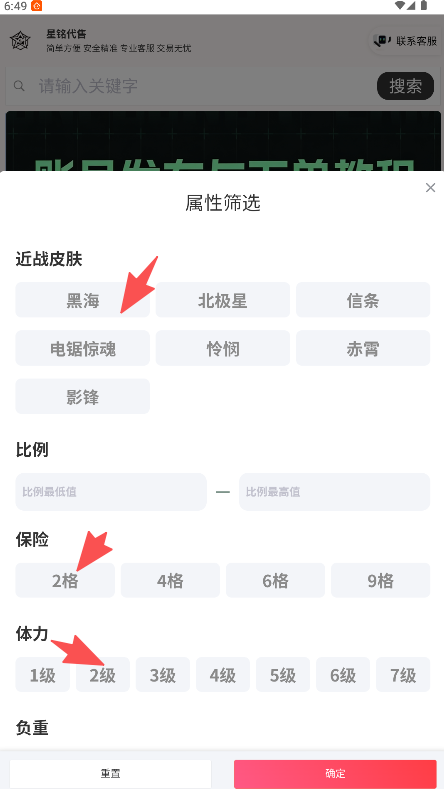 2、在屬性篩選界面按“保險(xiǎn)”“體力”“段位”等多維條件設(shè)定需求。