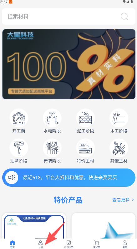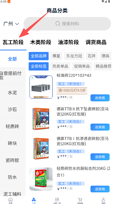 1、建材瀏覽與階段篩選功能,可按施工階段、材料類別查找商品。