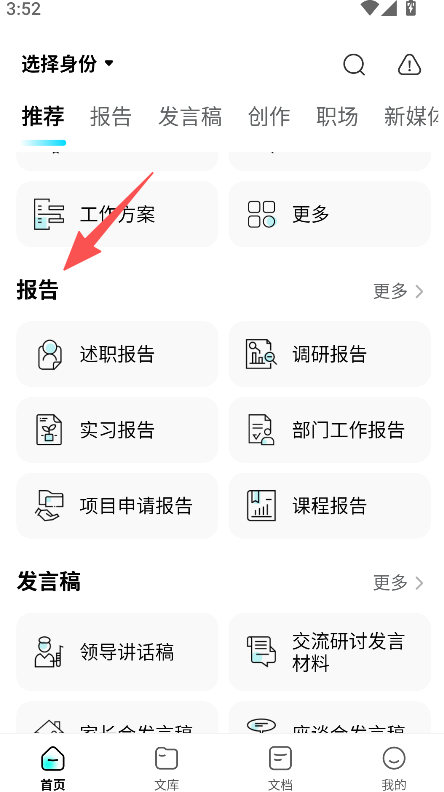 3、支持按文本類型細化選擇,如報告類下分述職報告調研報告等,精準匹配具體撰寫場景。