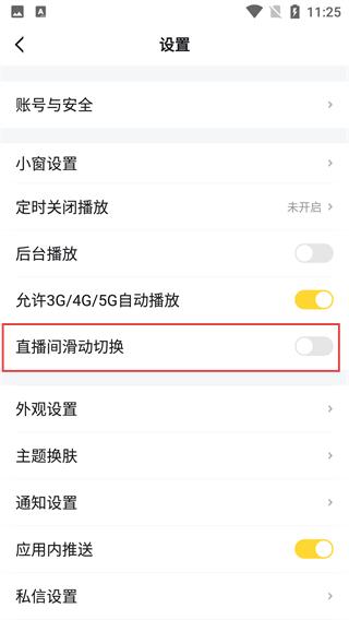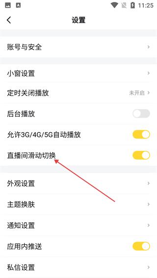 4、點擊該開關,可開啟或關閉直播間滑動切換的功能,完成設置操作。