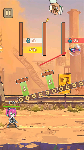 2、進入關卡后,滑動控制子彈到達箭頭所指區域優先獲得武器。