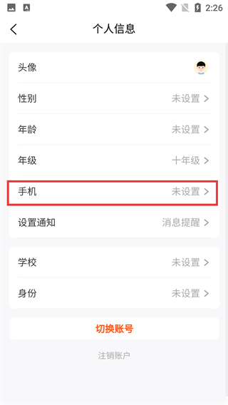 3、在【個人信息】頁面,找到【手機(jī)】選項可進(jìn)行相關(guān)操作。
