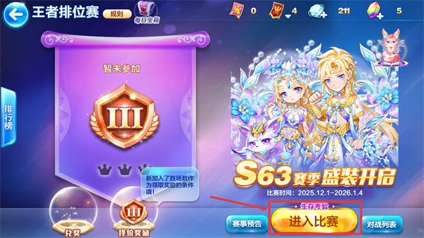 1、進入【王者排位賽】【S63賽季】界面,點擊【進入比賽】按鈕,參與排位賽以獲取段位獎勵和每日寶箱。