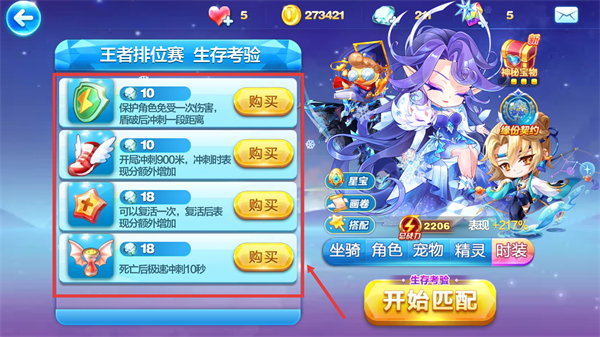 2、在【生存考驗】界面,可購買【保護盾】【沖刺鞋】等道具,增強生存能力后點擊【開始匹配】進入對局。