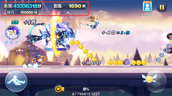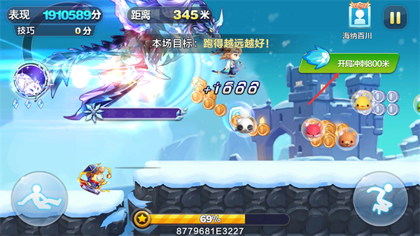3、游戲開局觸發【開局沖刺800米】,快速推進距離,同時收集金幣提升【表現分】與【技巧分】。